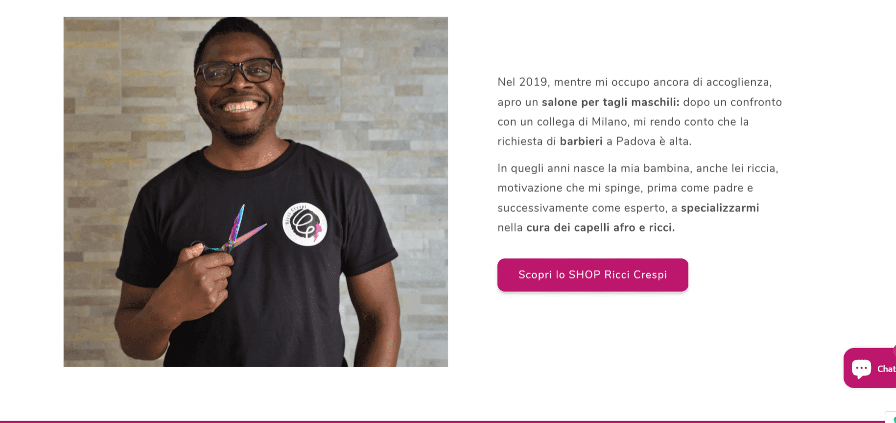Jean Claude è un Curly Hair Expert, proprietario del salone “Ricci Crespi” a Padova. Nel 2021 crea la sua prima linea di prodotti specifici per capelli ricci e decide di lanciare la sua attività online aprendo un e- commerce.